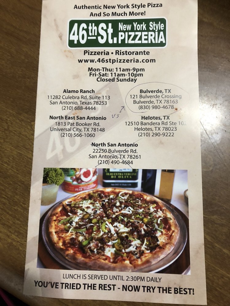 46th St. New York Style Pizzeria 2 is located in Bulverde, Texas and serves local residents and visitors seeking reliable New York-Style Pizza Restaurant services.